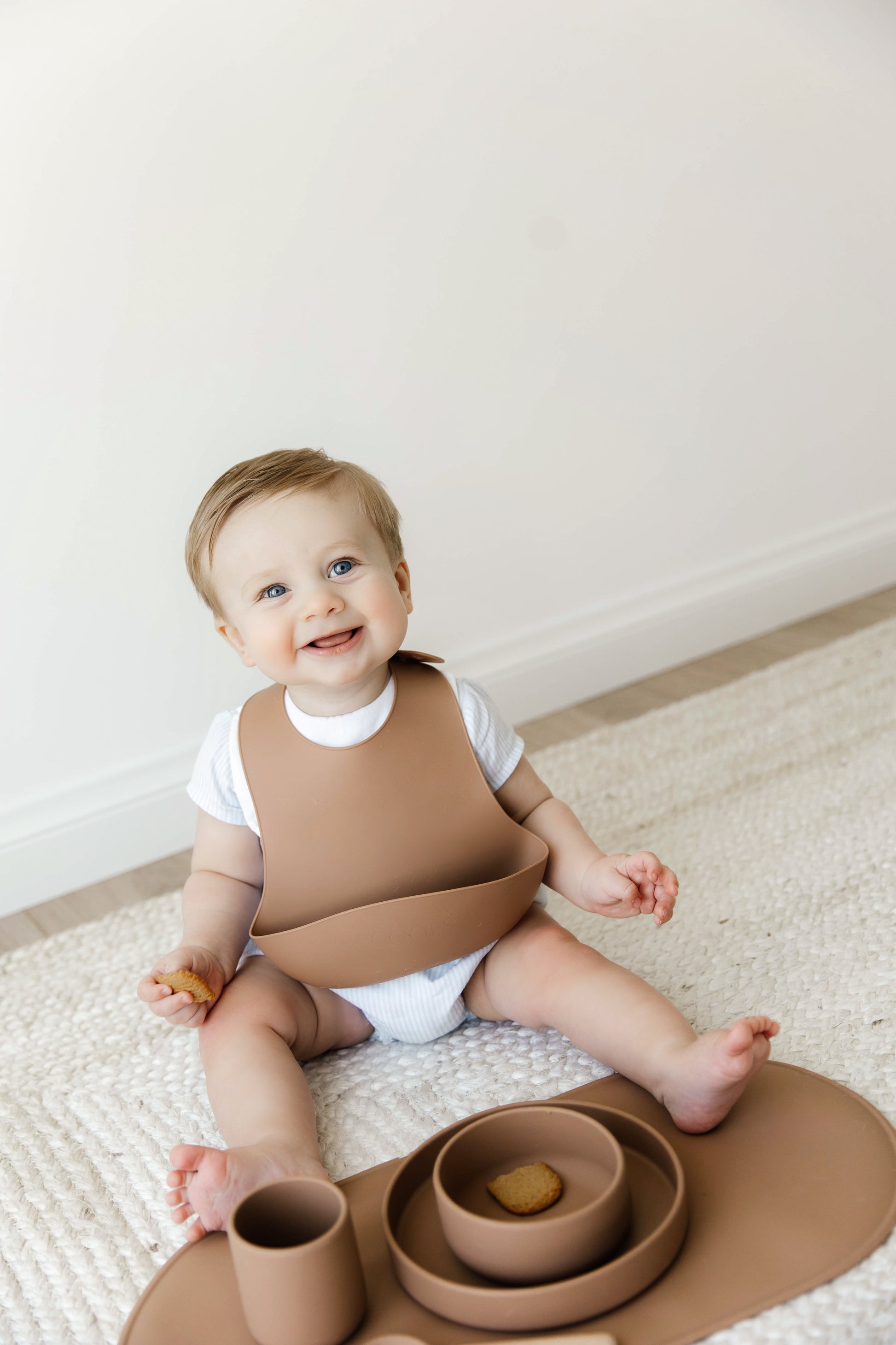6-piece baby weaning set made from BPA-free, non-toxic LFGB premium silicone. Includes placemat, bib, plate, bowl, cup, and a spoon with wooden handle, designed to support self-feeding and independent mealtimes.